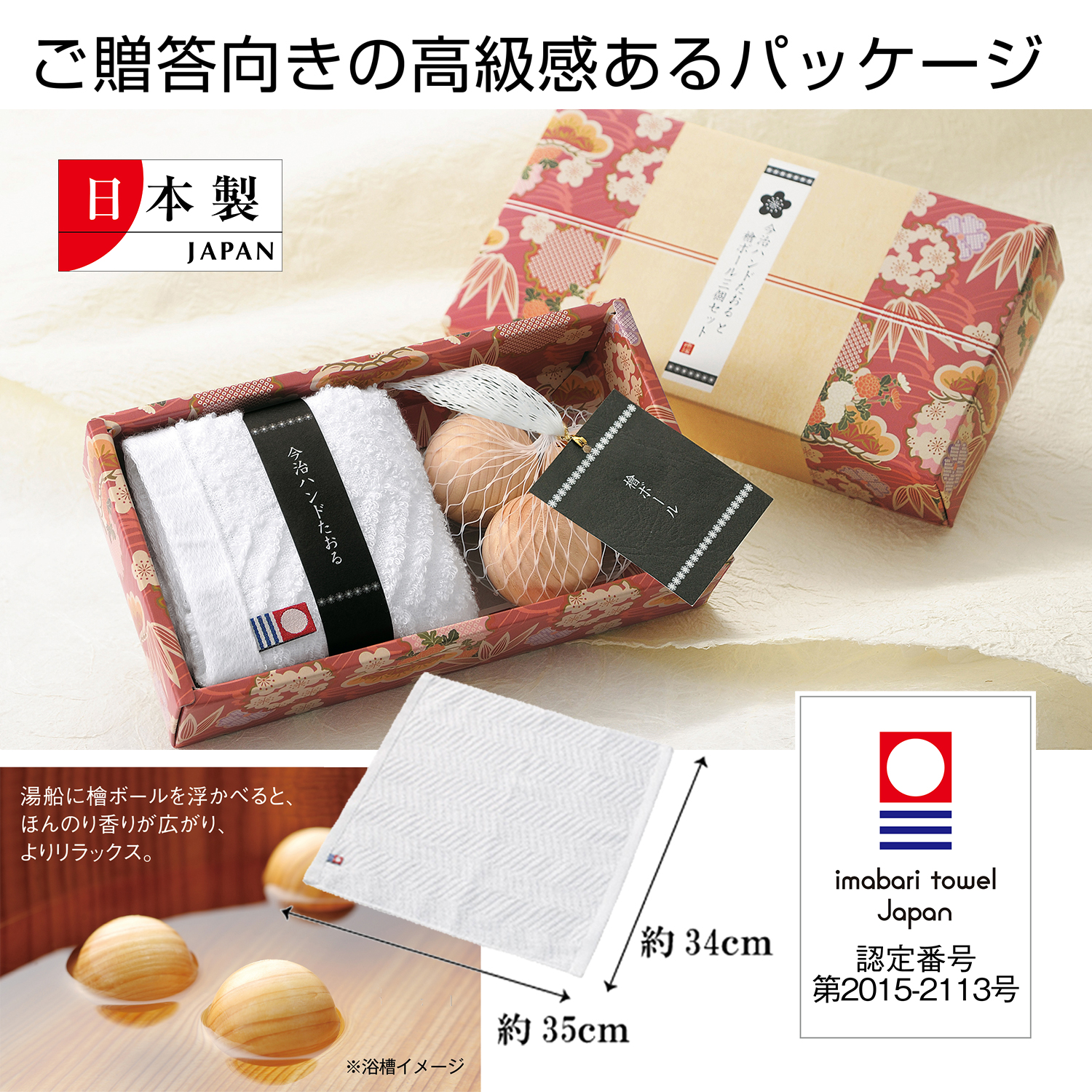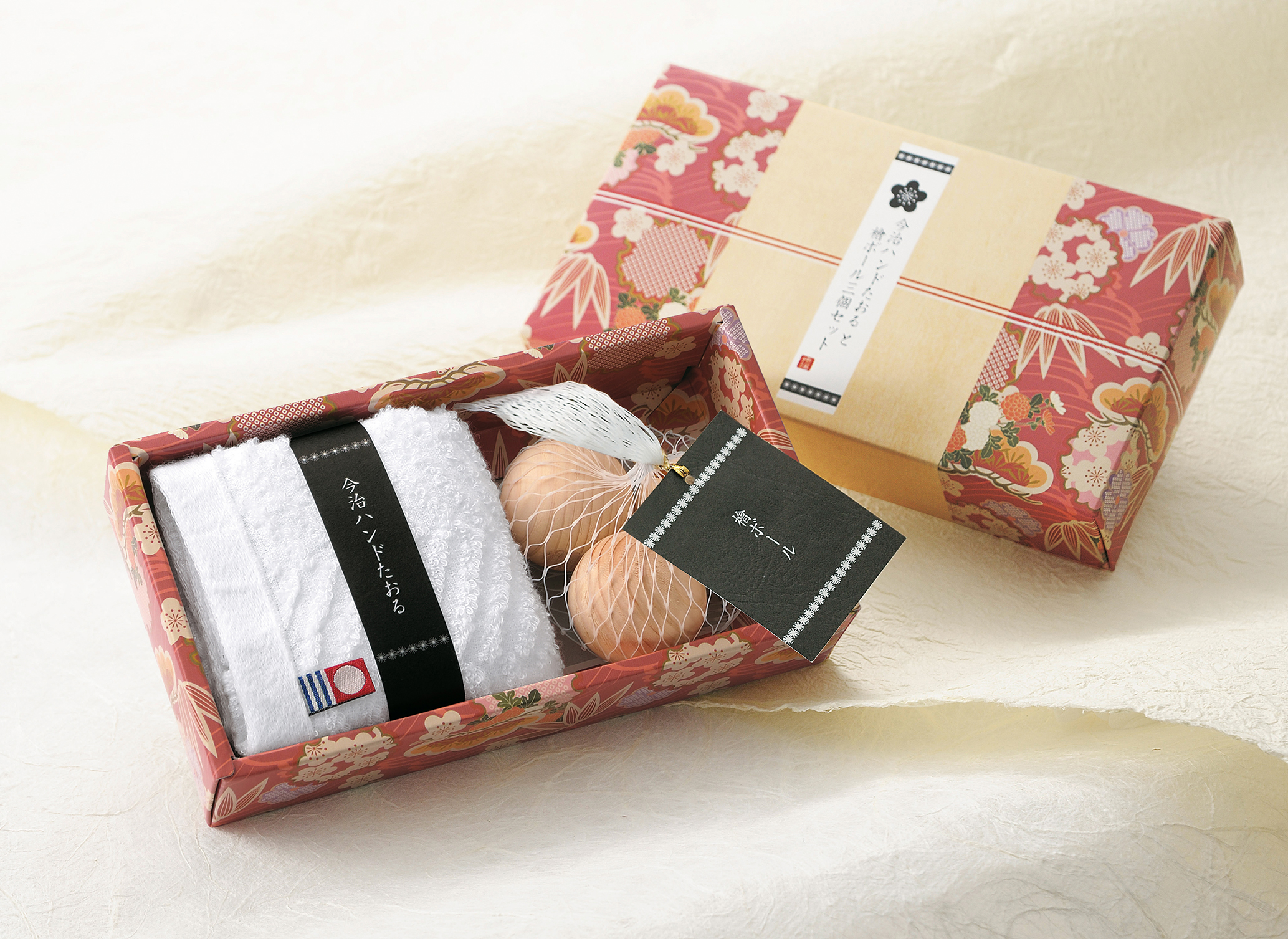 上質な今治ハンドタオルと天然檜ボールのセット。和をイメージした箱入りギフトです。