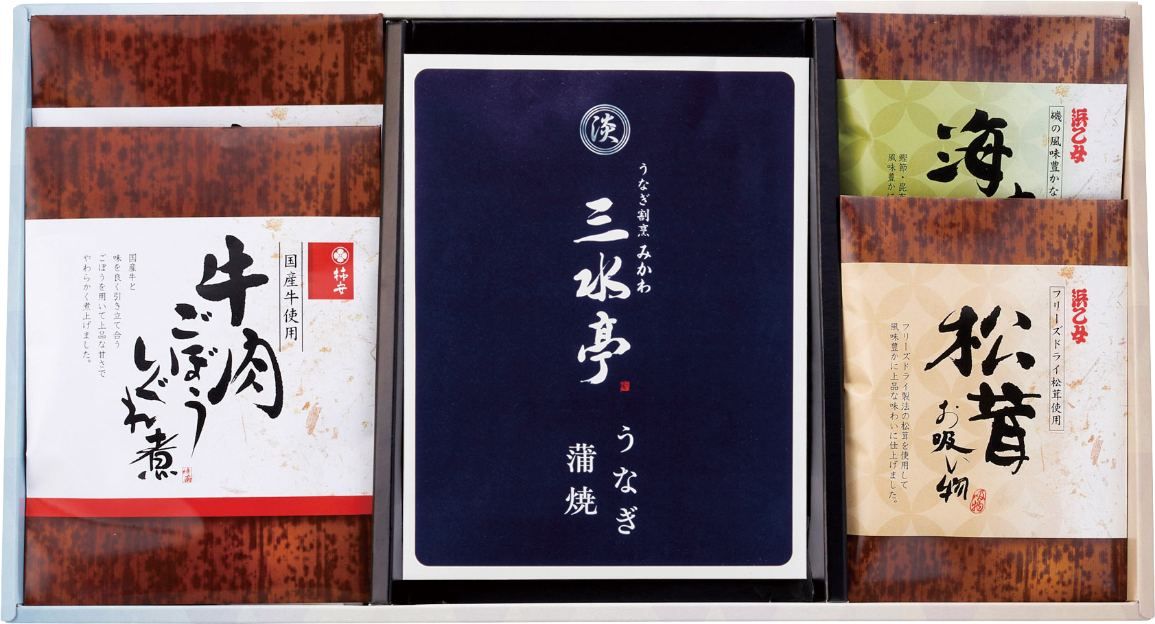 浜乙女のお吸物と柿安の牛肉ごぼうしぐれのギフトです。