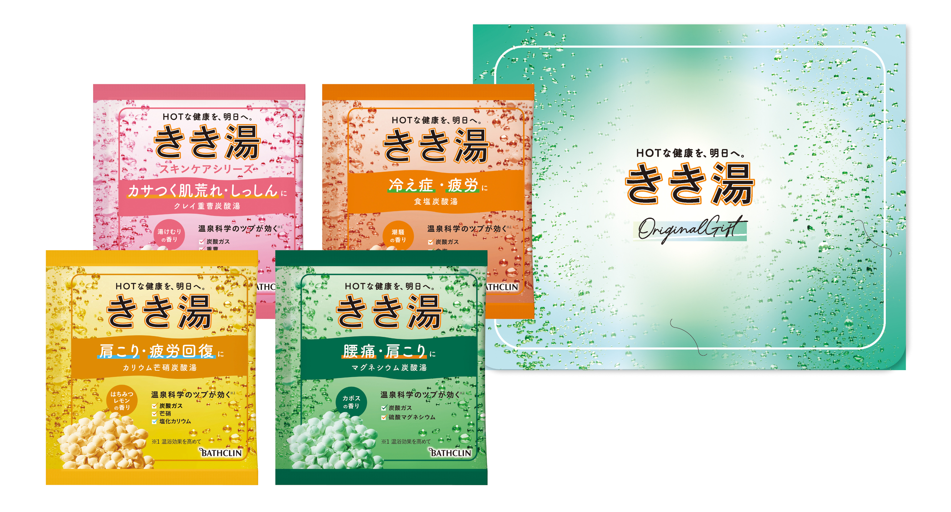 入浴剤:30g×4(マグネシウム炭酸湯・カリウム芒硝炭酸湯・クレイ重曹炭酸湯・食塩炭酸湯×各1)
