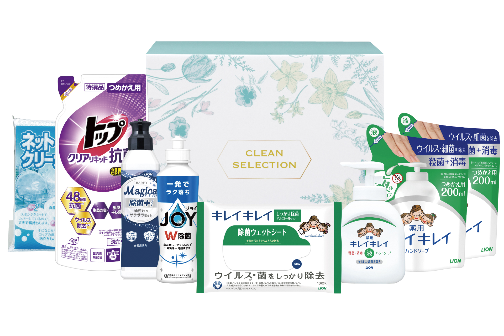 薬用ハンドソープと、「除菌」効果のある洗剤の詰合せ。