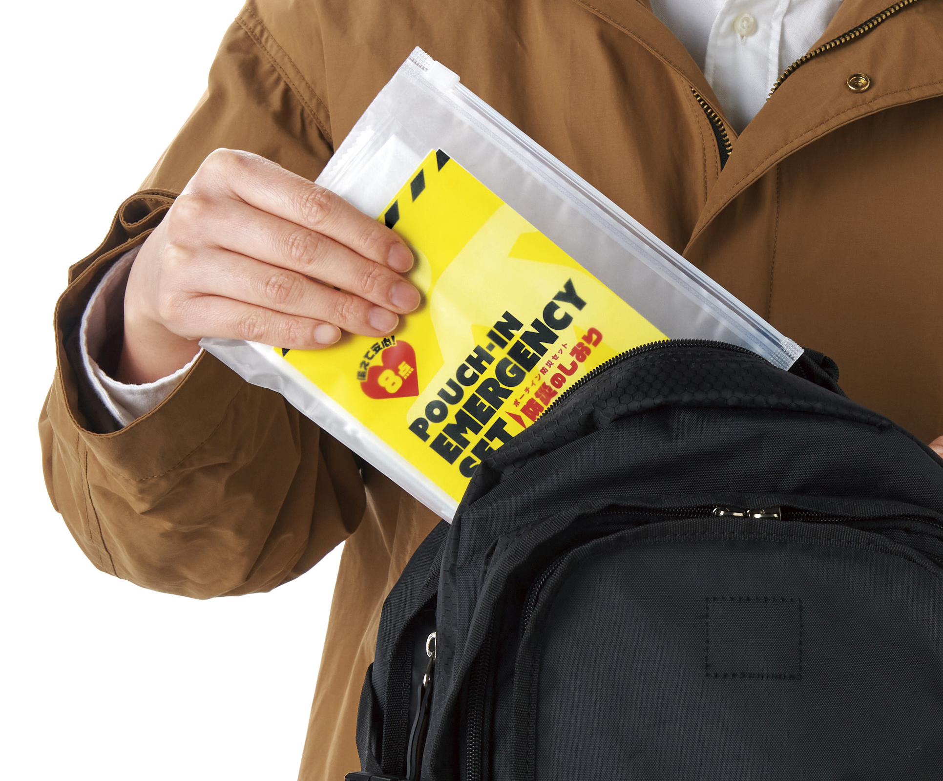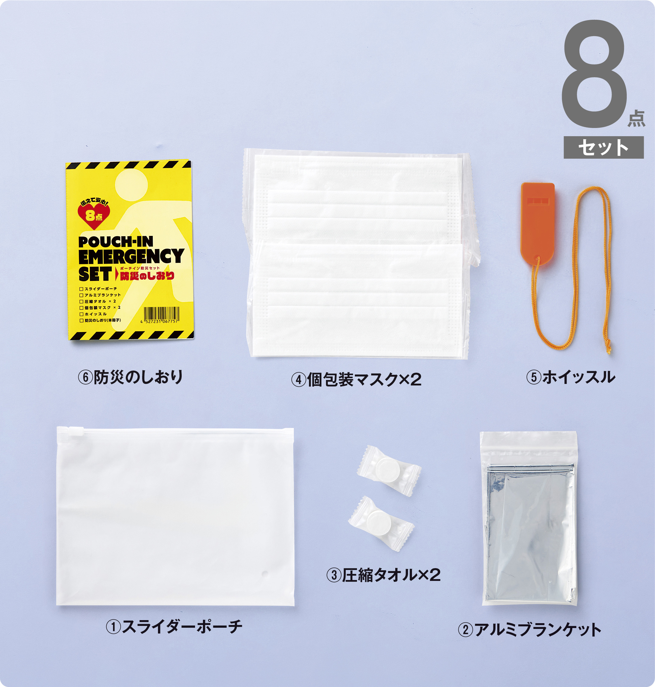 あると助かる防災グッズを装備した8点セット。