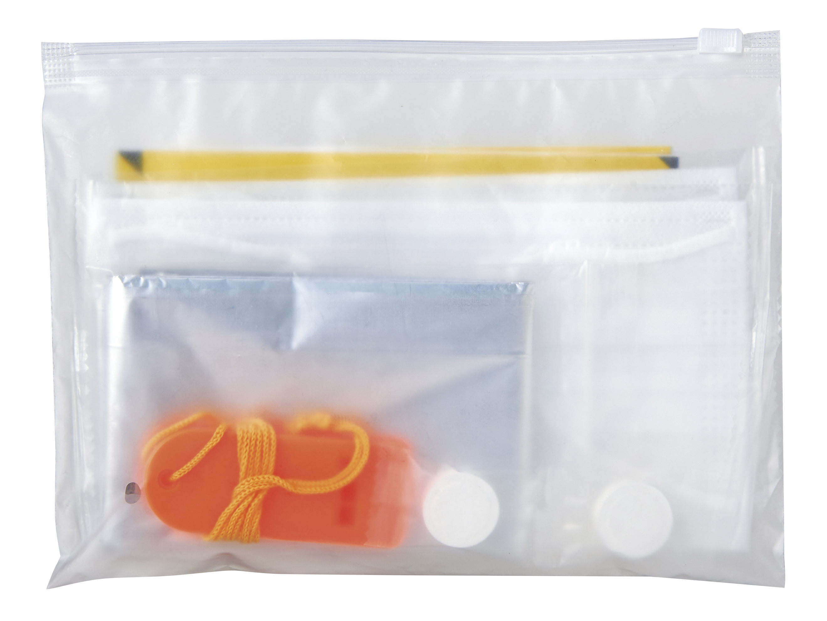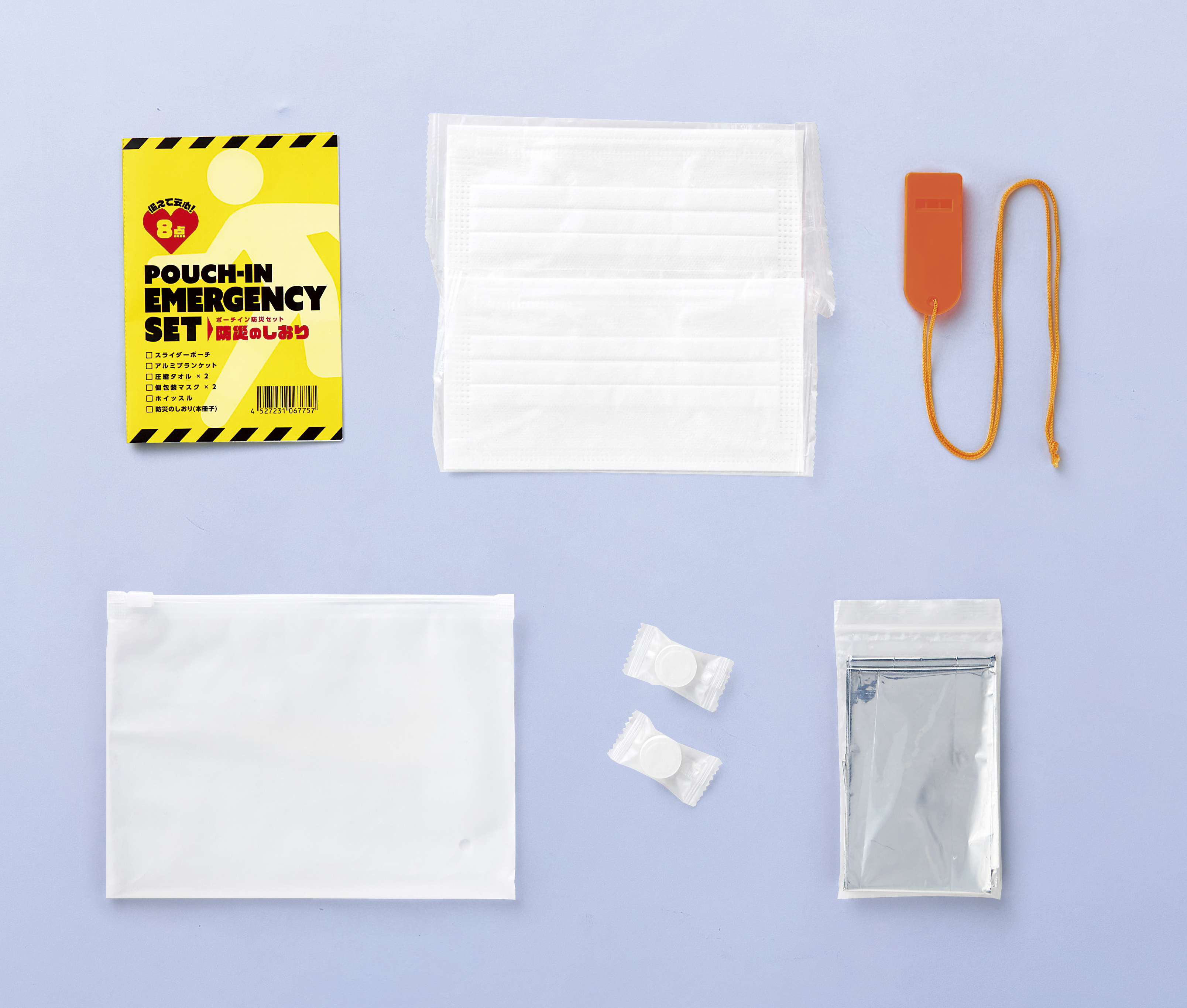 圧縮タオル×2・個包装マスク×2・ホイッスル・防災のしおり