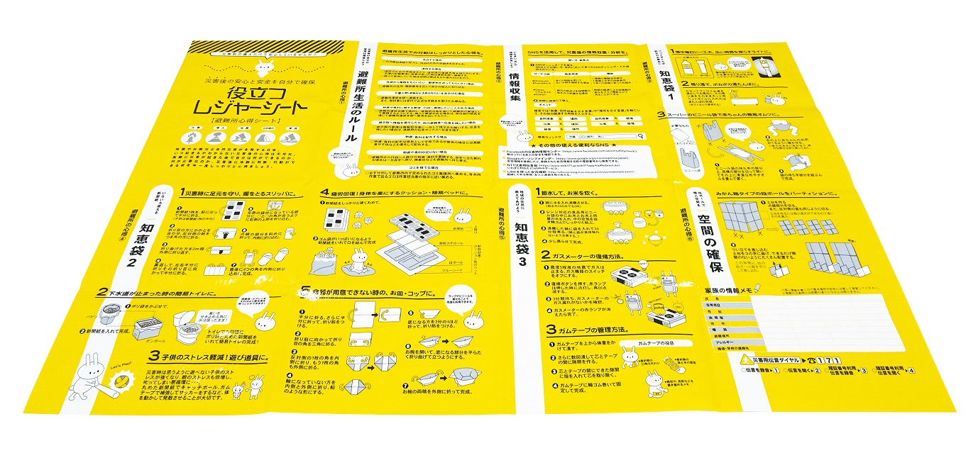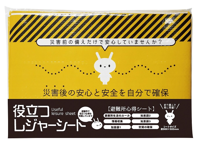 避難所での心得がプリントされたレジャーシート